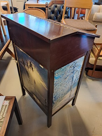 Skrivepult i fineret mahogni og glas, fra 1980erne.