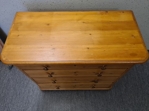 | Kommode fra 1940'erne I massiv fyrretræ. Fremstår pæn, velholdt og udmærket funktionsdygtig. Dog med ganske få brugsspor på toppen (billede) og umiddelbart uden nøgle. Højde 88 cm. Bredde 94 cm. Dybde 46 cm.
