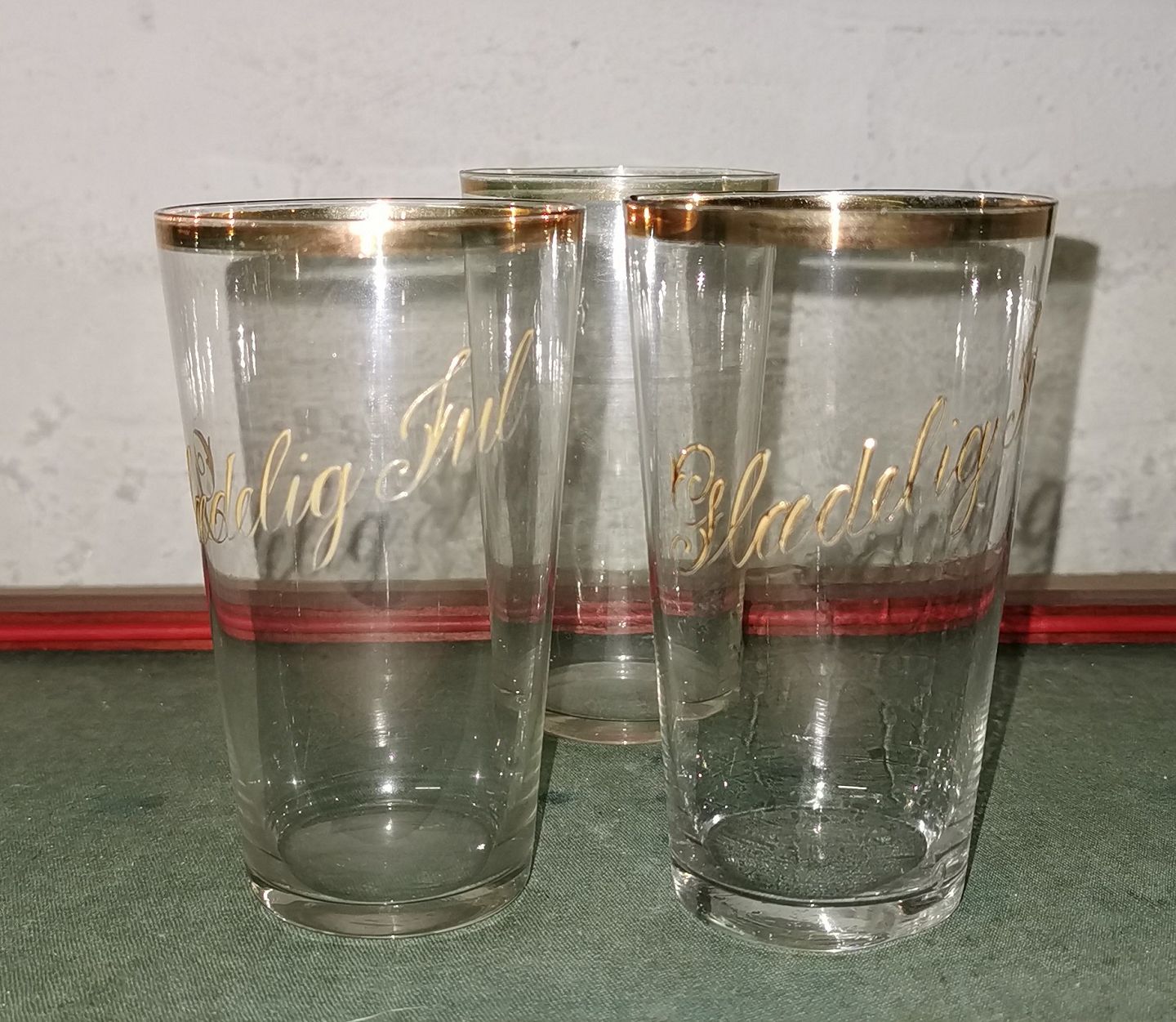Tre glas fra Fyens Glasværk. To med julehilsen "Glædelig Jul" i emalje. Alle tre i god stand uden skader eller reparationer. H. 12 cm.