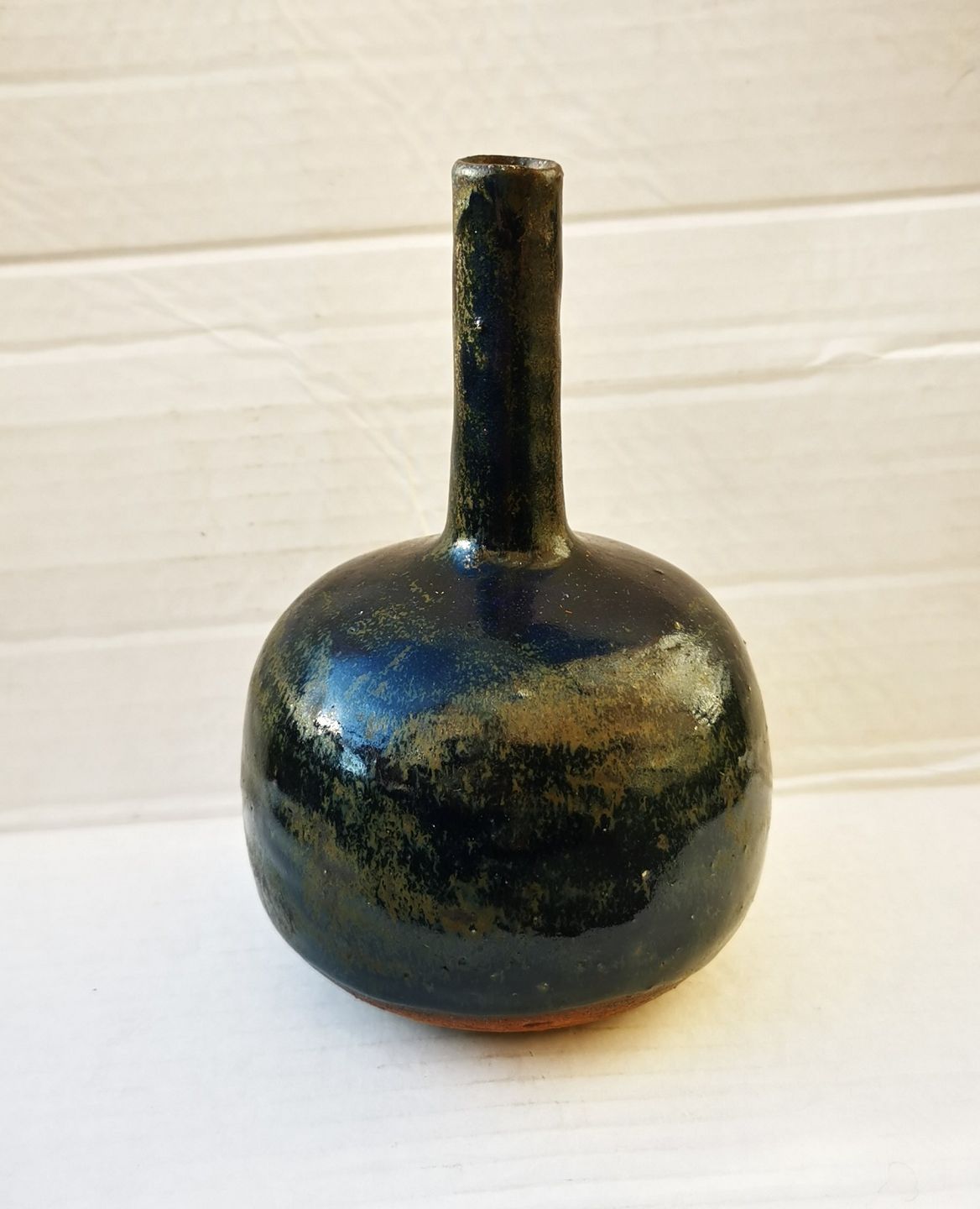 Vintage round stoneware vase with long neck made by Conny Walther, Denmark. Partly covered in a heavy brown glaze. Stamp marked on the bottom with CW for Conny Walther. In good condition. No damages or repairs. Measures: 14½ cm (5.70 inches) high.