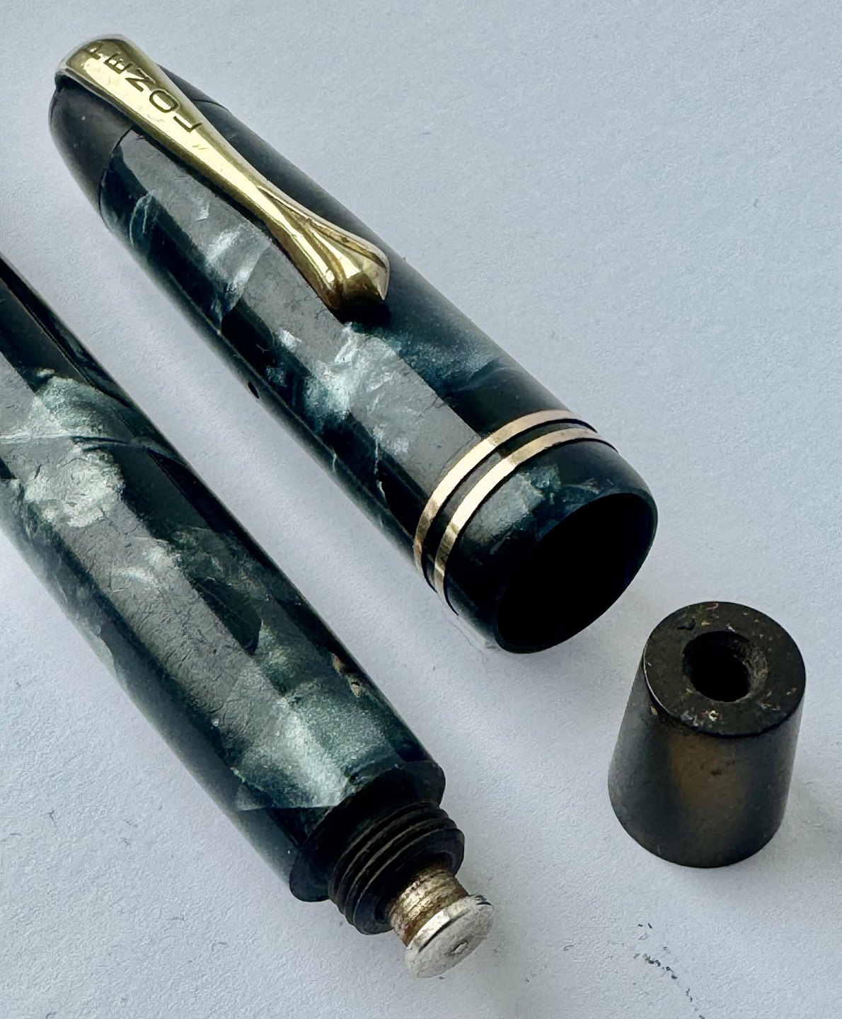 Blå marmoreret Penol Ambassador no. 5 fyldepen. Push button filler. Der skal indsættes en ny gummisæk før den igen kan optage blæk og skrive igen. Ny gummisæk kan indsættes for et tillæg på kr. 250,- Alle dele originale til denne model. Ingen skader eller reparationer. Dog mangler “knappen” på den lille korte bundskrue, hvorfor der er hul - se fotos. Længde 13 cm
