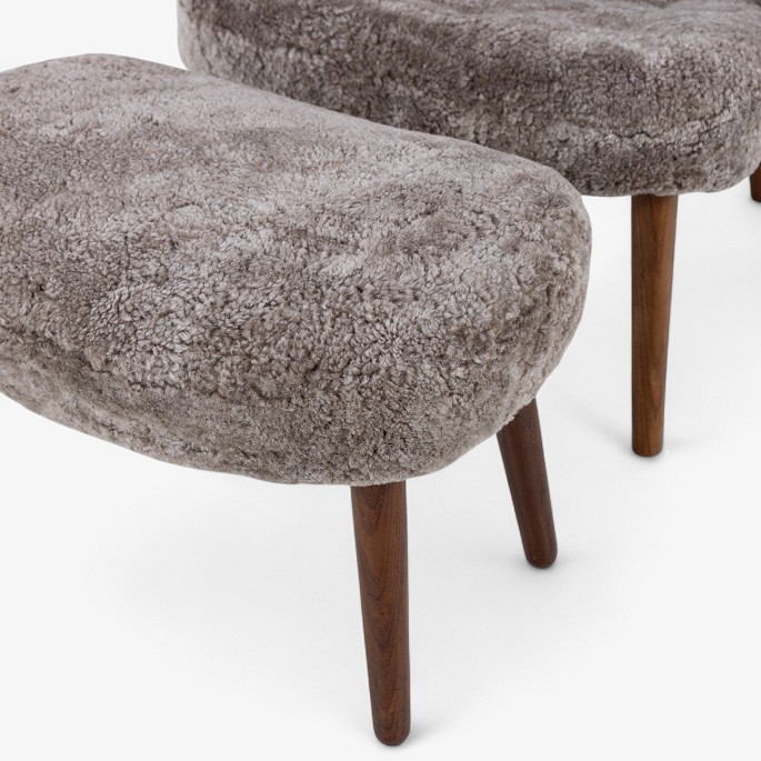 Nybetrukket lænestol med skammel i Scandilock-lammeskind (farve: Cork 19) og ben i hhv. teak og elm.