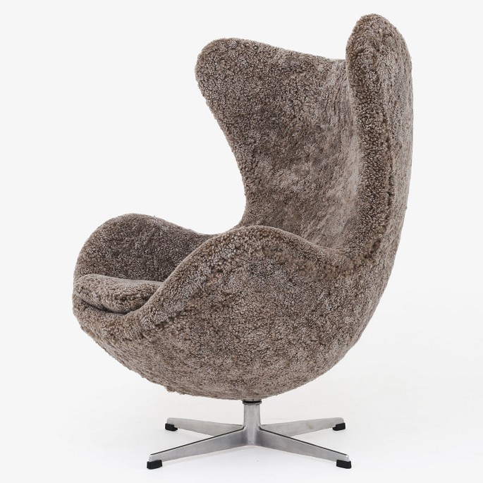 AJ 3316 - Nybetrukket 'Ægget'-lænestol med skammel i lammeskind med (Sahara 07, Curly 17mm) med helstøbt aluminiumsfod.