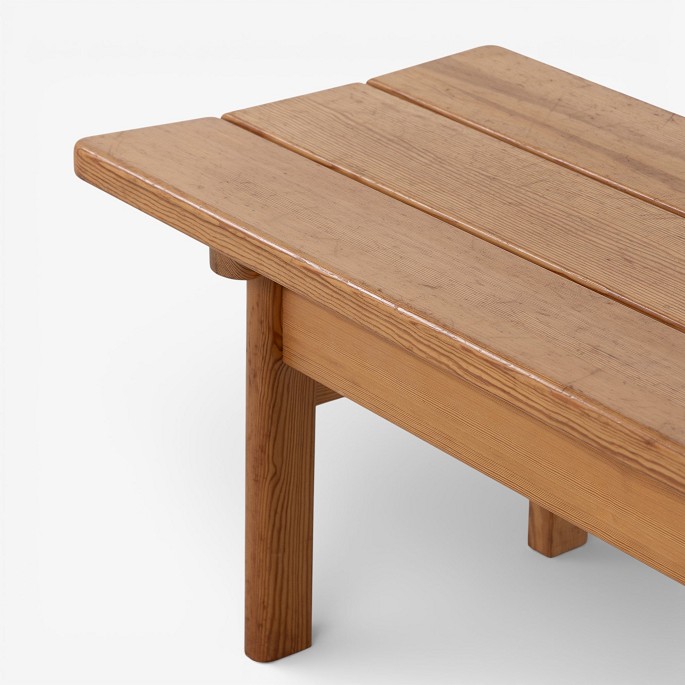 Bænk i massiv, lakeret fyrretræ. Mærket fra producent.