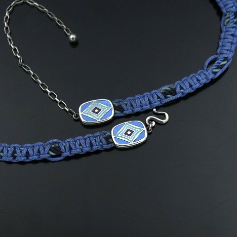 Georg Jensen. Macramé Necklace with Sterling Silver Enamel Panels - Naja Salto.