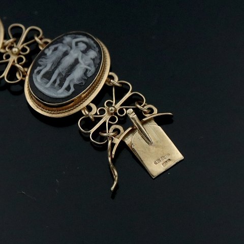 Armbånd i 18k guld med kamé-udskæringer. Stemplet 18k Italy. L. 17,3 cm. Width 1,8 cm. Vægt 16,8 g. Brugt i god stand.