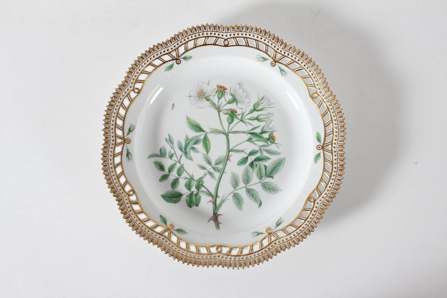 Royal Copenhagen Flora Danica Rundt fad nr. 20/3574 m/takket og gennembrudt blondekant Dekoreret med blomst "Rosa canina L. var albiflora" og stempel fra 1957 Diameter 28,5 cm 1. sortering, meget fin stand
