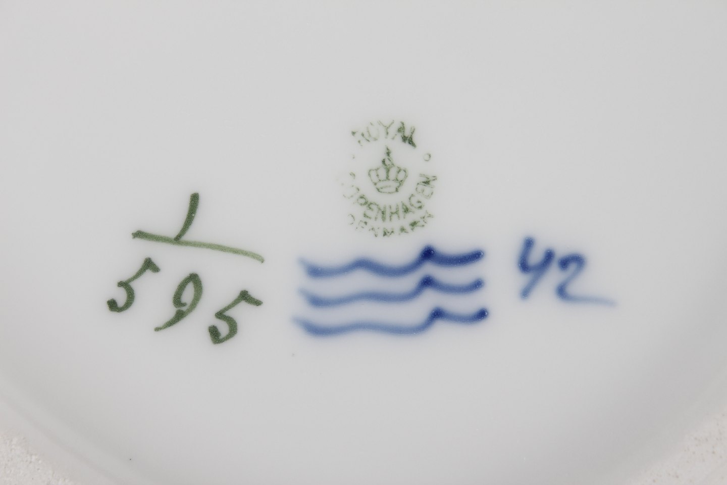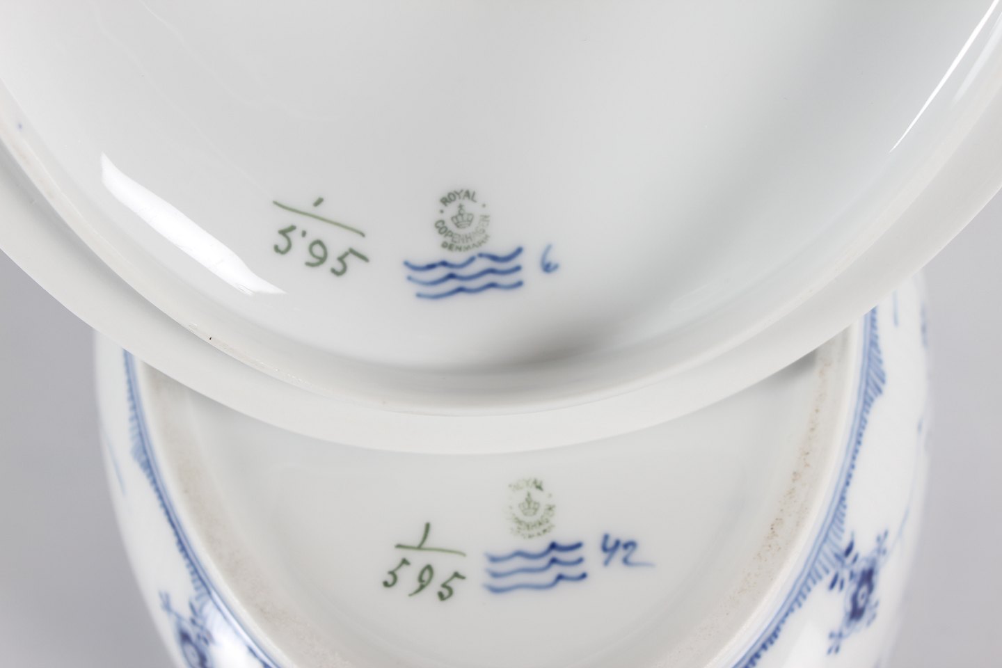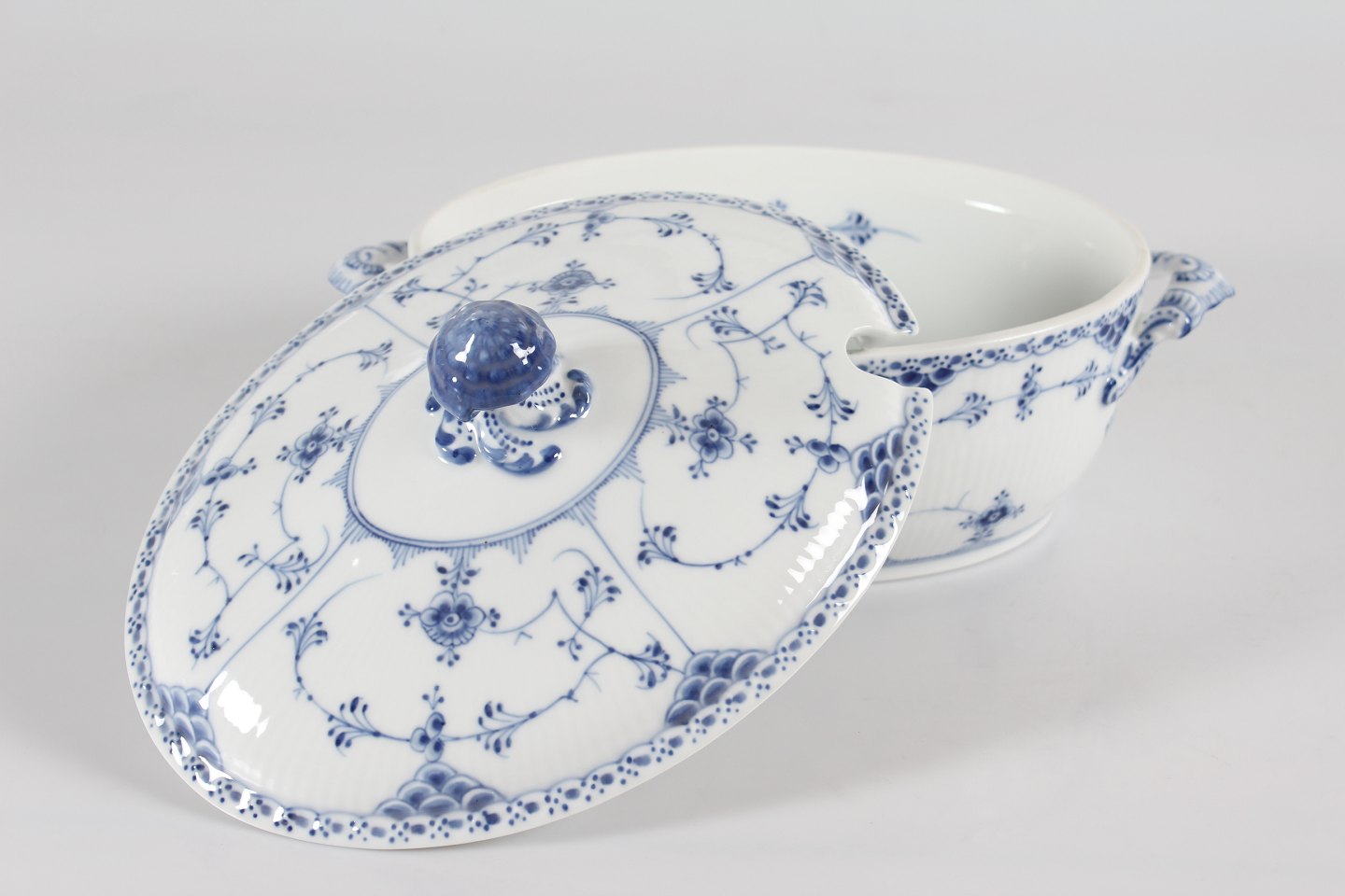 Royal Copenhagen Musselmalet Halvblonde Stor oval terrin nr. 1/595 Med stempel fra perioden 1923-34 Længde 32 cm Bredde 21 cm Højde 20 cm Fejlfri 1.sortering