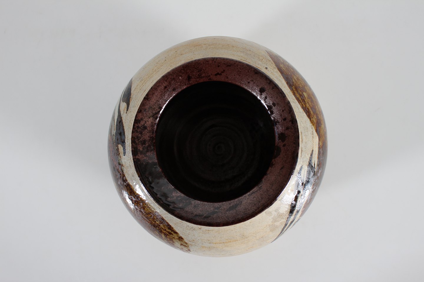 Conny Walther Stor bred krukke af stentøj med abstrakt glasurdekoration Sign. monogram for Conny Walther fra hendes eget værksted Diameter 23 cm Højde 17,5 cm Fin stand uden skår eller rep.