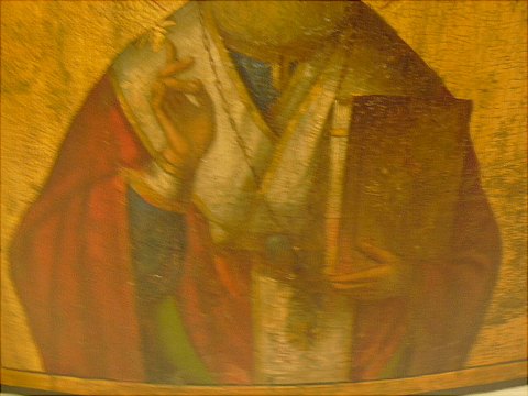 Han var fængslet fordi han Prædikede imod Arius. Følger man udviklingen i portrætterne af den hellige Nicolaj, dukker der en ny type op i slutningen af 1700-tallet, hvor hans hoved nu prydes af en mitra. Samtidig bliver detaljer som hår og skæg mere naturalistiske,