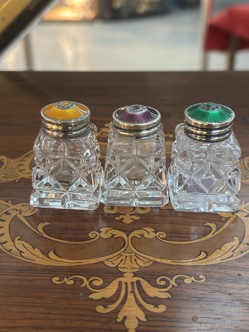 Saltbøsse i krystal , sterling sølv top med emalje ,