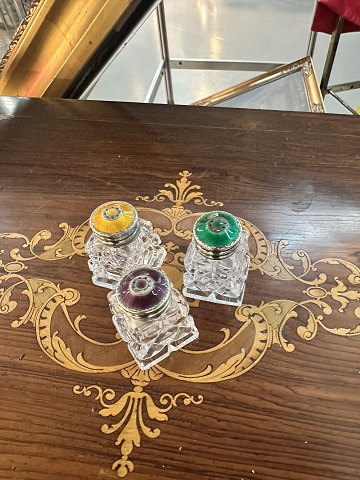 Saltbøsse i krystal , sterling sølv top med emalje ,