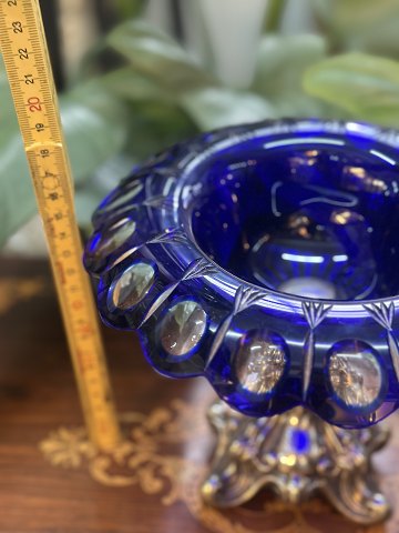 Bohemia Rund skål med bølget kant og stor åbning monteret på en ornamenteret metalfod i baroksstill .sølvplet med dekorerede akantusblade og svungne fødder