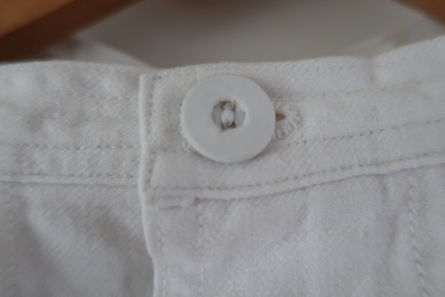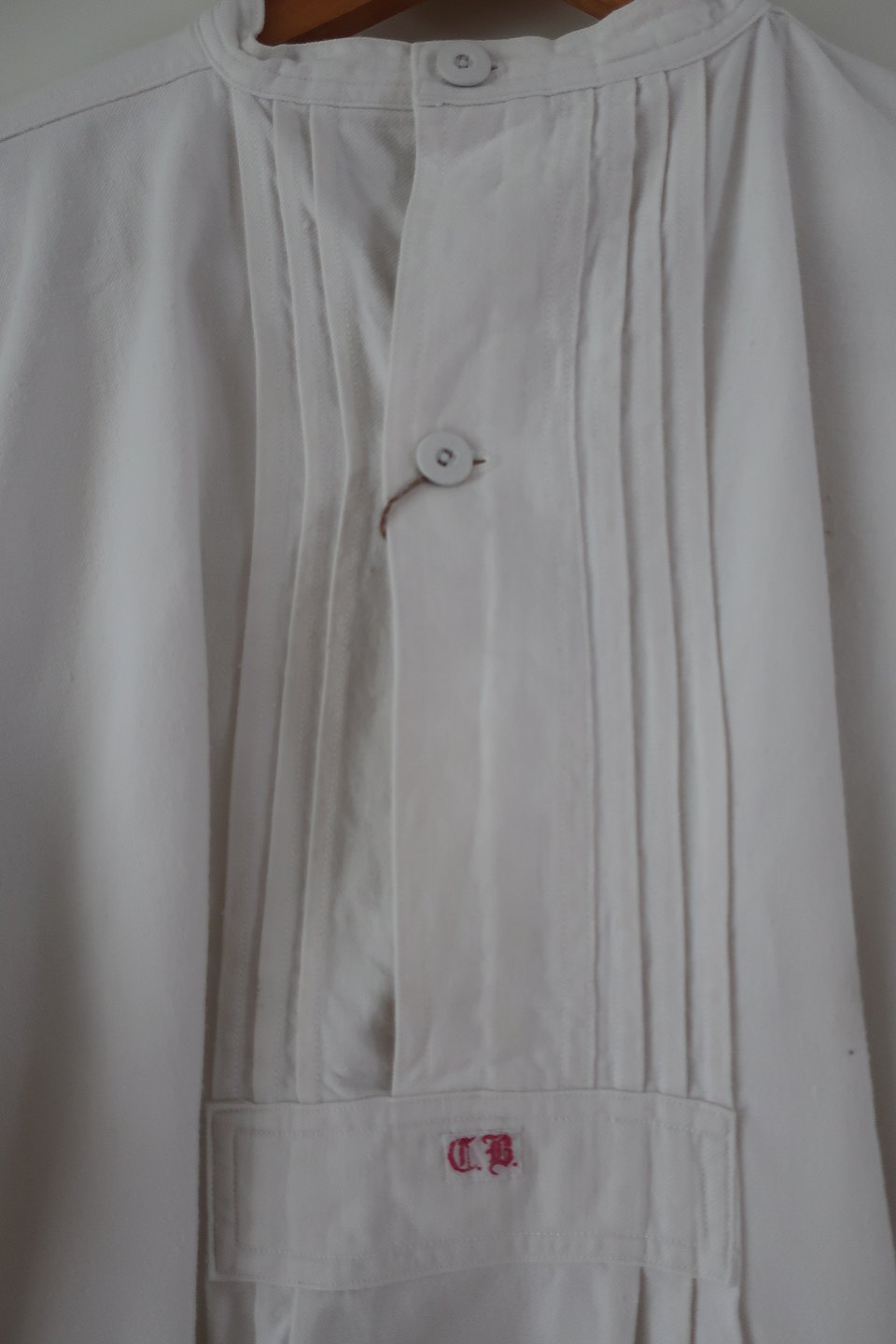 Særken er med håndbroderet knaphuller, håndbroderede initialer samt anden pynt.
