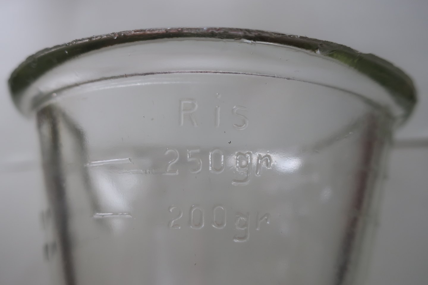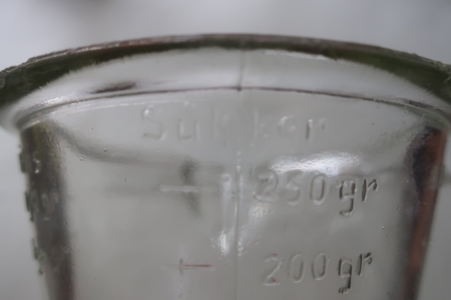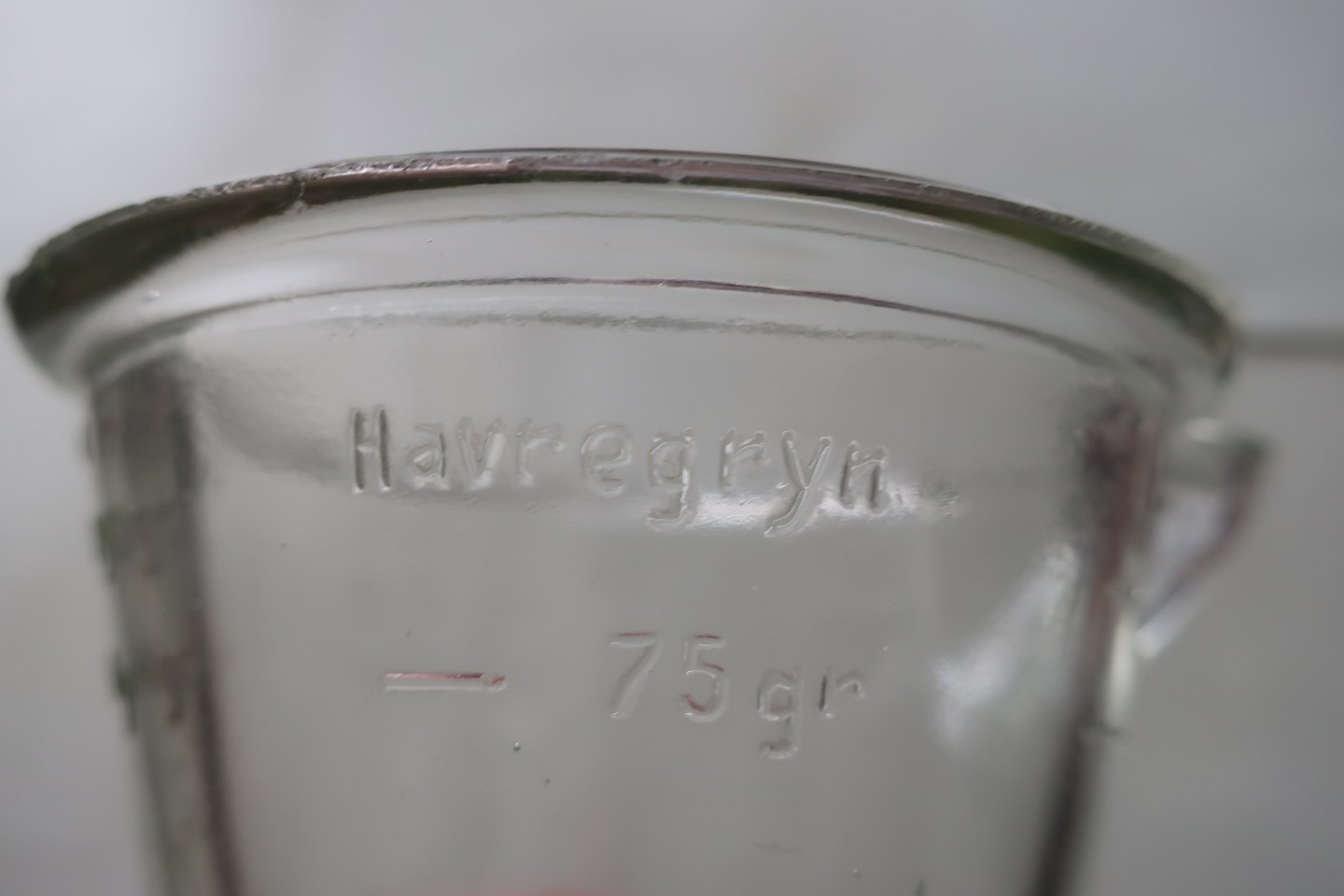 Mængde-/vægt-angivelse i gram, liter, deciliter for f.eks. sukker, ris, mel, havregryn, f.eks. 250 gram eller 75 gram