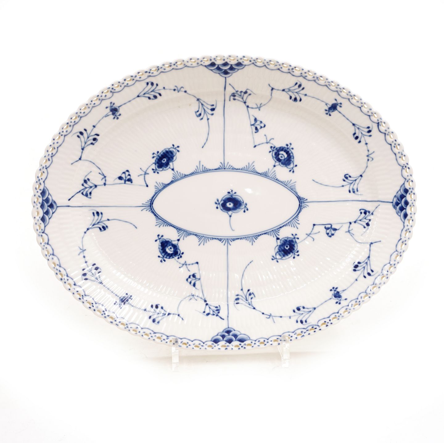 Royal Copenhagen: A large oval blue fluted full lace plate #1/1148 L: 36,5cm Item number: 1/1148