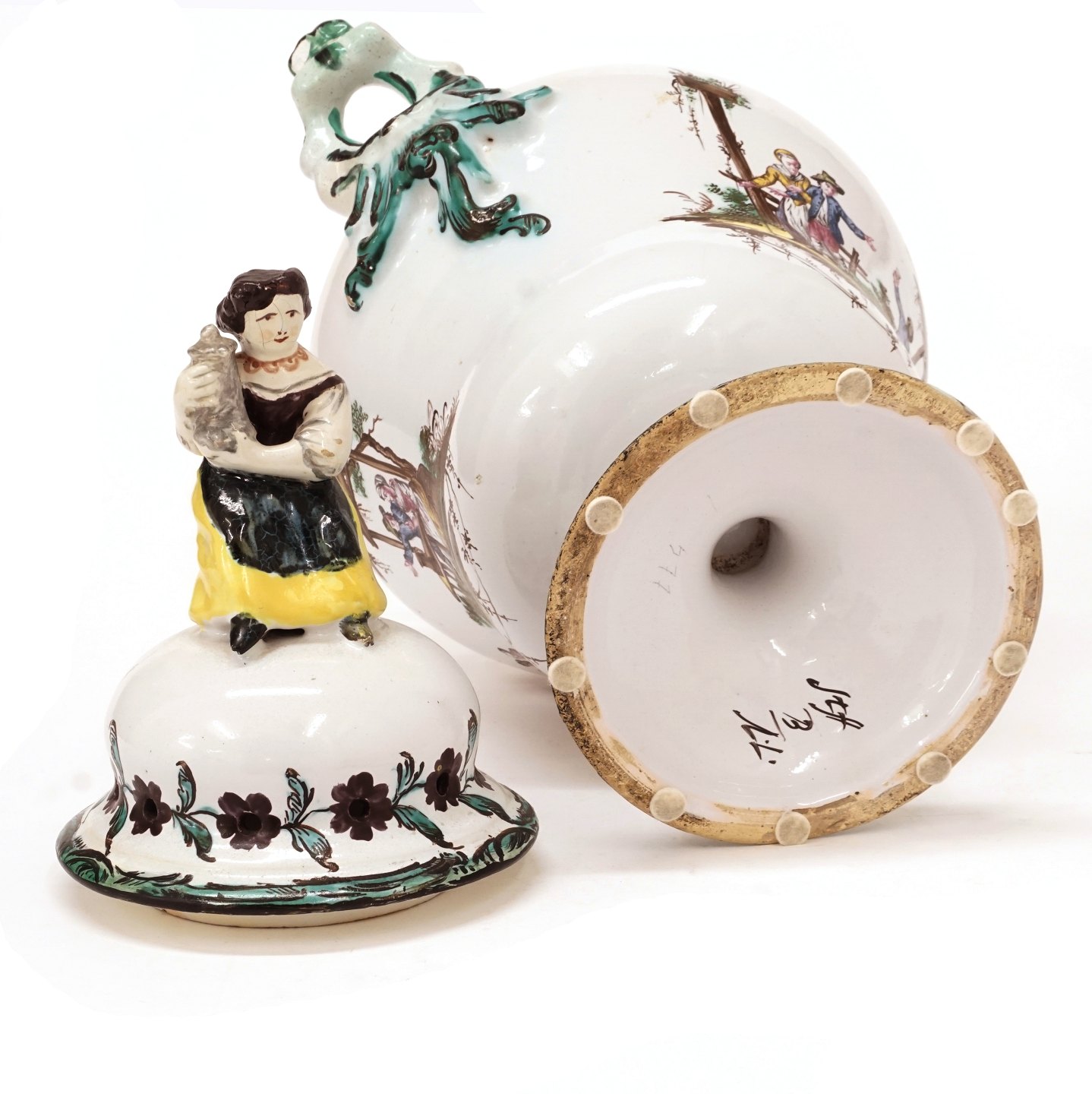 Polychrome lidded Rococo faience vase by the manufacture of Stockelsdorf, Northgermany. Signed Stff / B / AL, Stockelsdorff, director Buchwald and painter Abraham Leihammer 1772-74. H: 38cm