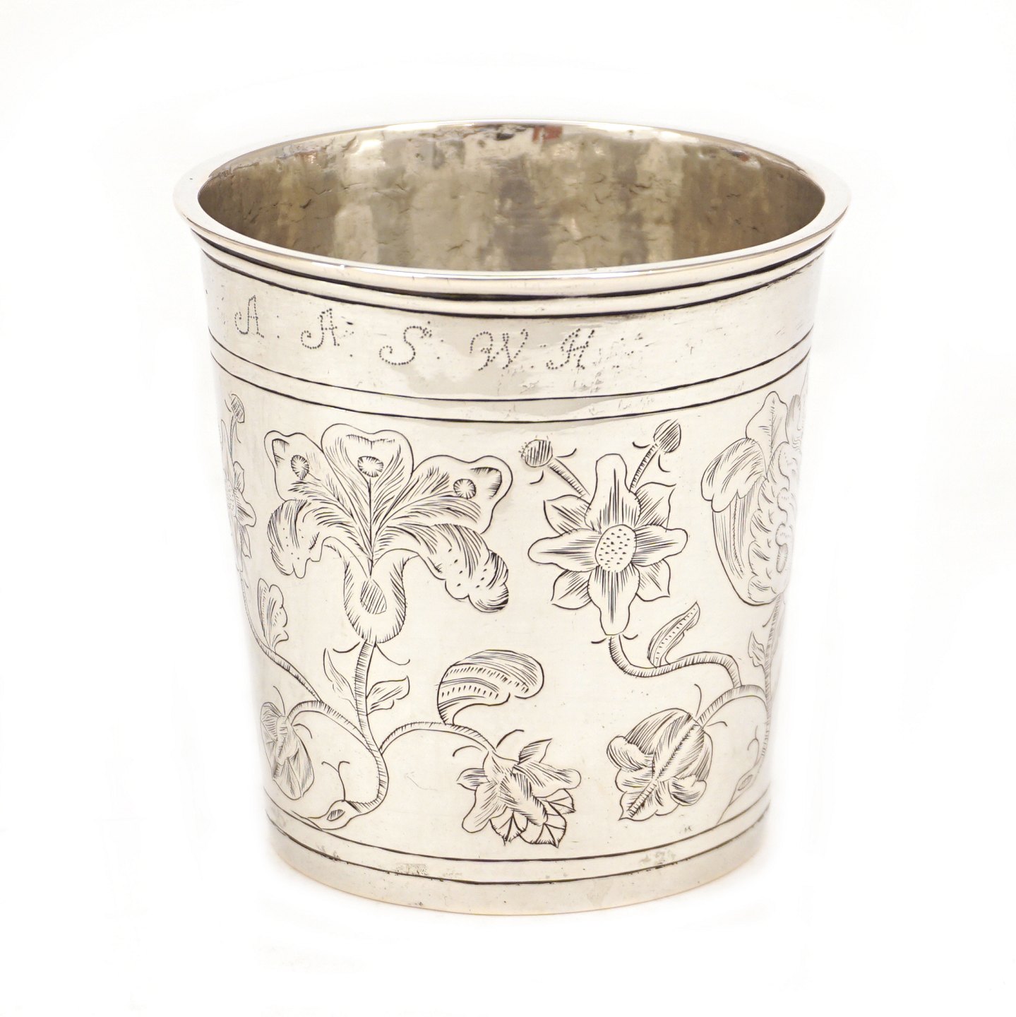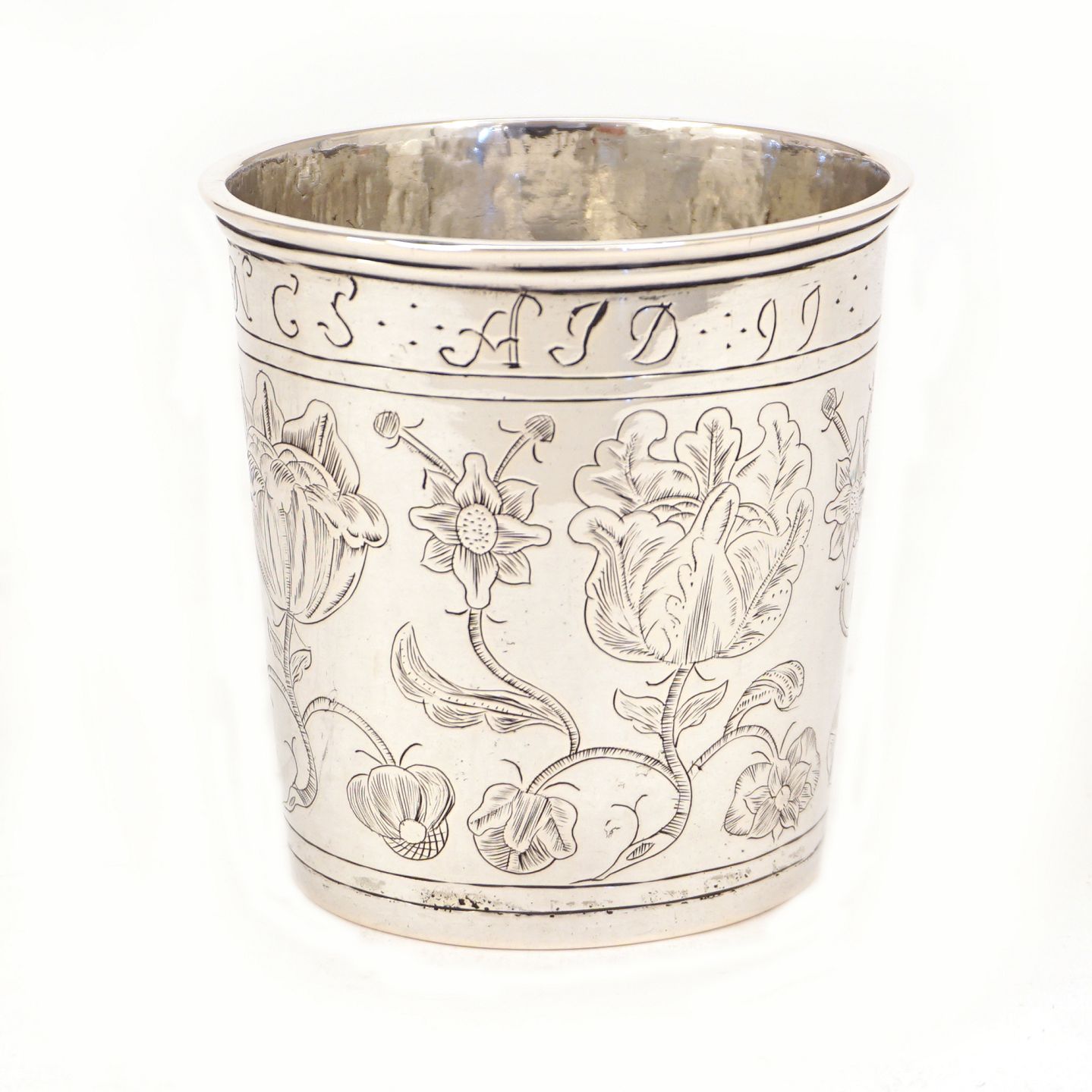 Kleiner schwerer Silberbecher datiert 1699. Dänemark. H: 7,1cm. V: 103gr