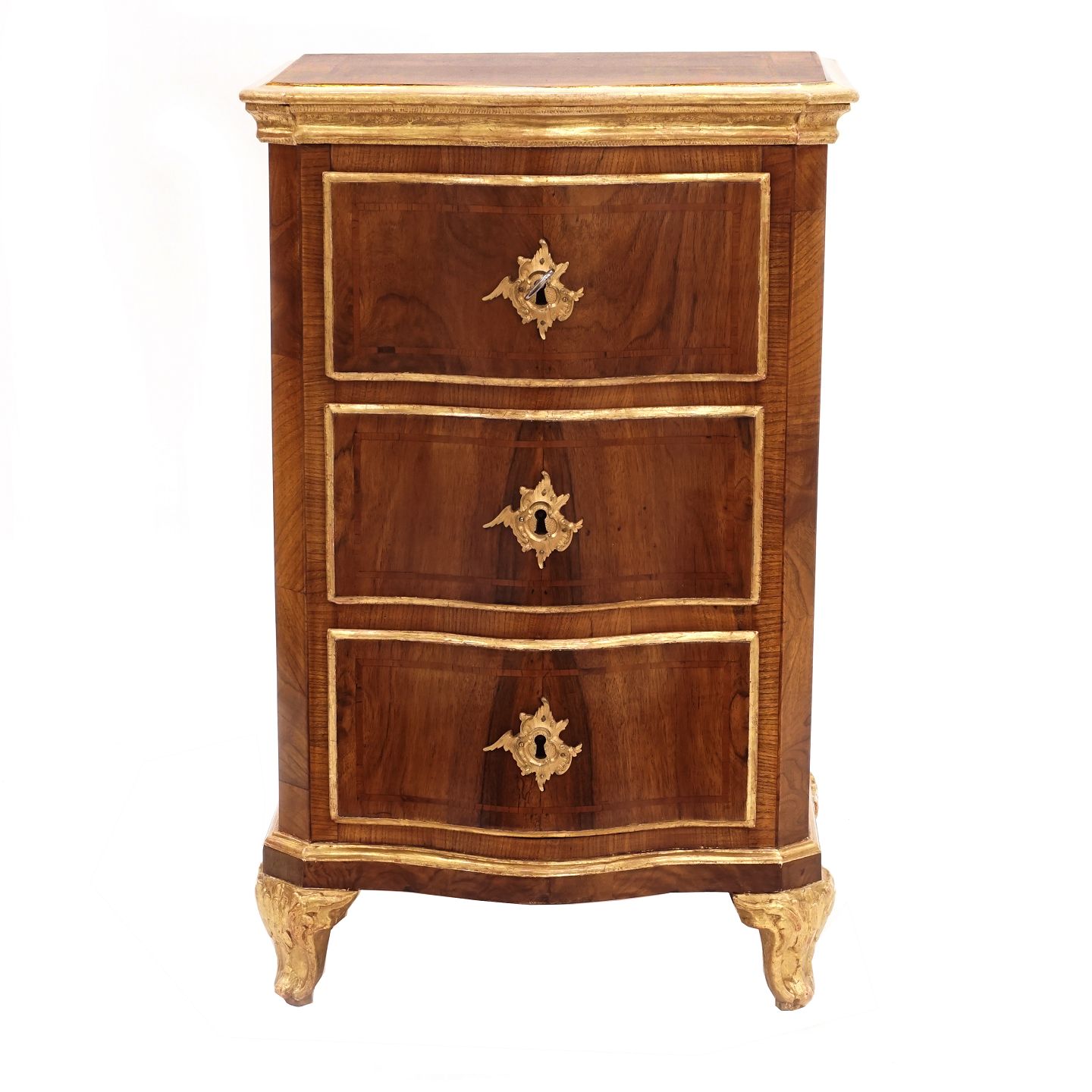 Kleine Dänische Barock Kommode. Nussbaum mit Vergoldungen. Dänemark oder Schleswig-Holstein um 1750. H: 79cm. Platte: 50x41cm