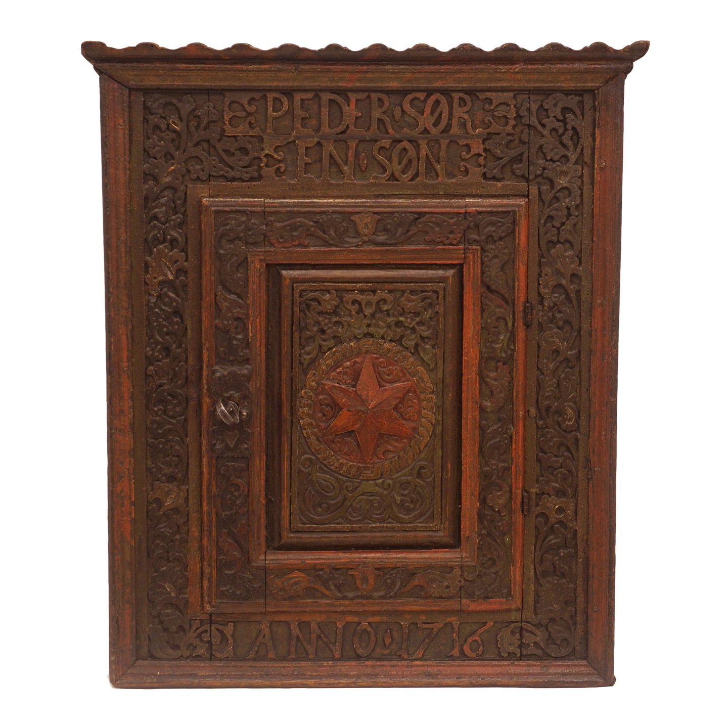 Small original decorated Danish Baroque cabinet. Dated 1716. Owners initials Peder Søren Søn. (Son of Peder Søren). H: 66cm. B: 56cm. D: 33cm