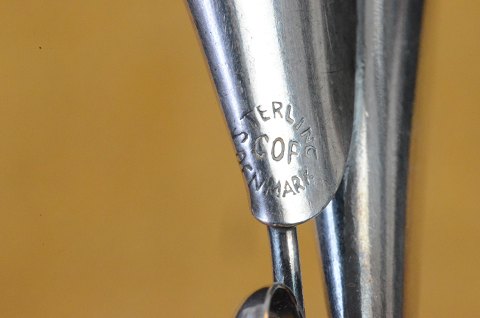 Brooch of silver shaped as small twig with 2 knobs and 2 curved leaves. Stamped Sterling COF Denmark. Carl Ove Frydensberg - Copenhagen 1949 - 1982. Str .: 6.5 * 2.3 cm. Art No. 73