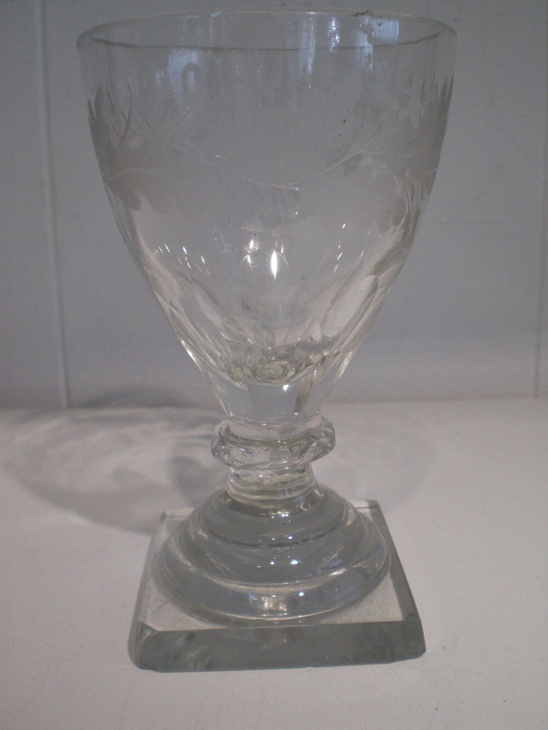 Svensk, rødvinsglas med facetsleben kumme, på firkantet fod med egeløvsdekoration, 7 flige i blad, 2 agern, knap på stilk. Højde: 13,2 cm. Ca. 1870. Fin stand; men med små tidstypske afslag/nedslid på et par af fodens hjørner.