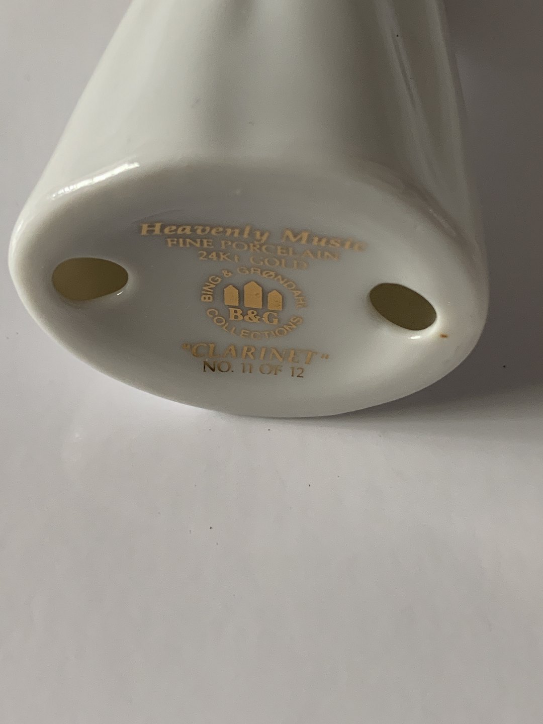Bing & Grondahl. Heavenly Music. Clarinet No. 11 of 12. White porcelain angel with gold inlay and gold wings (24 carat). The series is called "Angel with Instruments" and consists of 12 pieces.