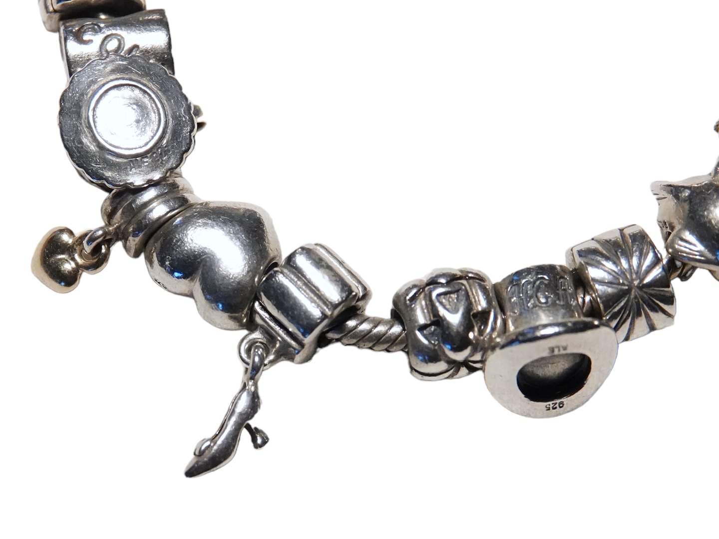 Pandora sølv Armbånd med 28 charms - heraf to små af guld og flere andre udgåede i sølv og nogle af dem også med lidt guld på. Længde 20,0 cm. Velholdt stand.