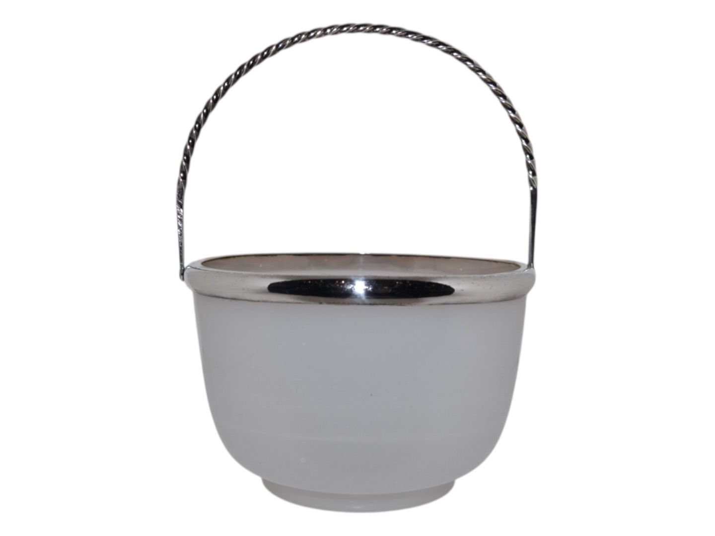 White opaline glass sugar bowl with silverplate handle from the 19th century. Diameter 12.0 cm., height 8.0 cm. There is an old inscription in the handle, please see the picture. Excellent condition.