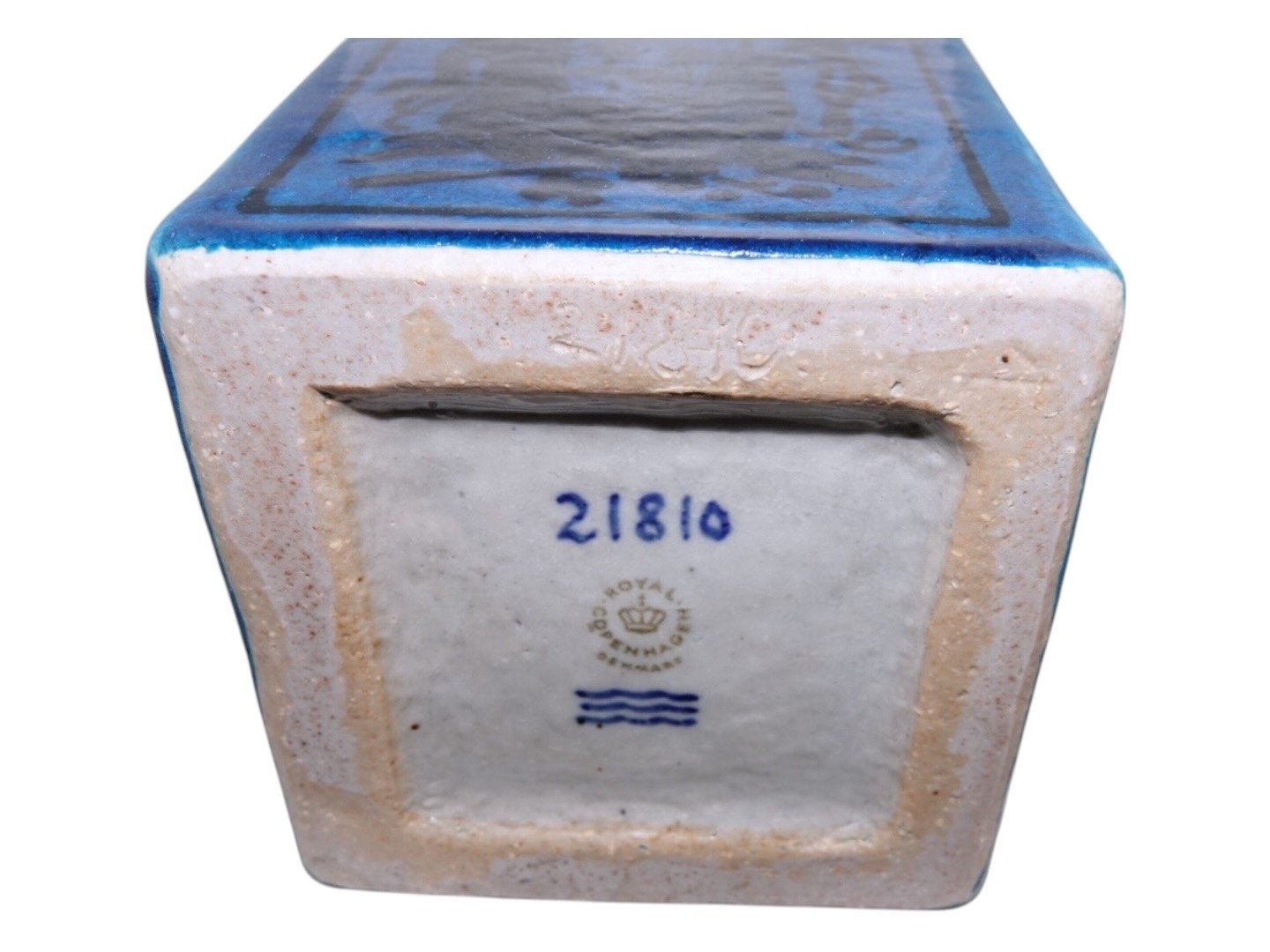 Royal Copenhagen blå vase dekoreret med damer designet af Johannes Hedegaard. Dekorationsnummer 21810. 1. sortering. Højde 24,0 cm. Perfekt stand uden fejl.