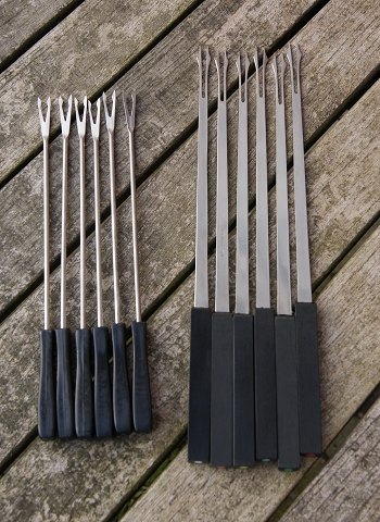 Fondue set of stainless steel on a swivel wooden tray from Digsmed Denmark, and with 2 x 6 forks. See more photos.
