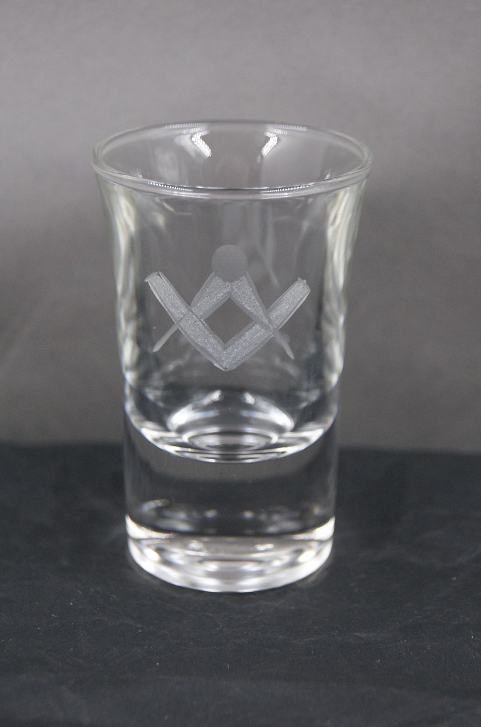 Dänische Logenglas oder Freimaurer Glas, Schnapsglas mit Symbolen verziert, auf rundem Fuß. Zirkel + Winkel und Akazienzweig. H 7cm - Ö 4,5cm Lager: 1 Bestellnummer: g-Snaps passer&vinkel