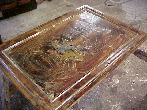 Ja, så beskidt kan et skab være! Afrensning af fedt, snavs og cigarrøg, hvorefter skabet er poleret op med ny lak.