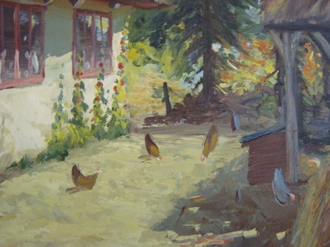 Maleri Gustav P. Rimmer - Gårdsplads med høns.