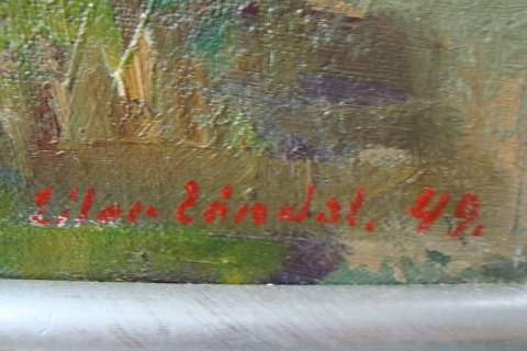 Haveparti med hus, bænk og blomstrende frugttræer 1949.