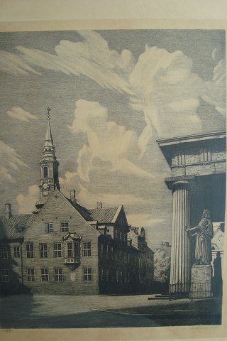Radering af J. Dragsbo - Indgangsparti til Vor Frue Kirke i København samt Bispegården.