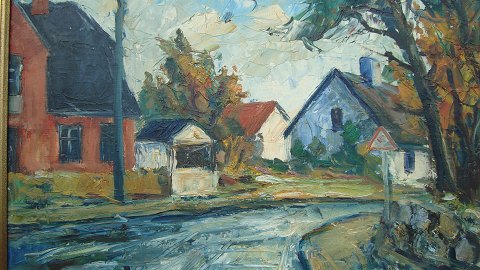 maleri af Finn Andersen - Landsby med iskiosk og vejskilt.