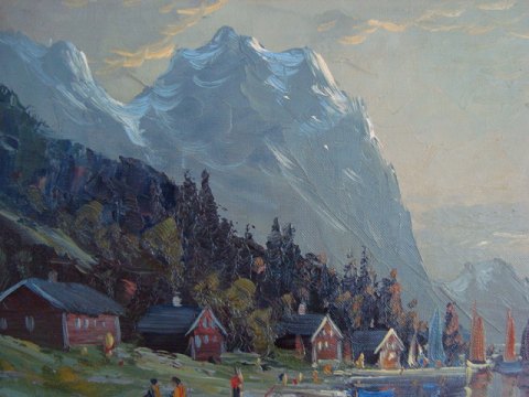 Maleri af Gustav P. Rimmer - Norsk fjordparti med bjerge.