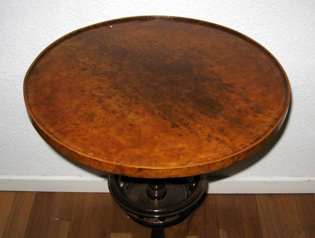 Rundt bord af birk, bøg og mahogni, plade båret af balusterformet søjle med kurv, på trepasfod. Biedermeierform. 1900-tallets slutning. H. 67,5 cm. Diam. 49 cm. Flot stand!