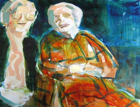 Poulsen, Sofus D. (20. årh.) Færøerne: To kvinder. Acryl på papir. Signeret. Sofus Poulsen 2002. 35 x 46 cm.