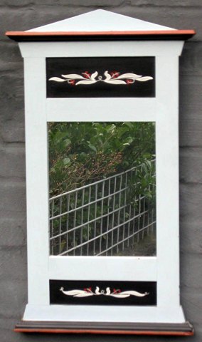 Lille dansk spejl, medio 1800-tallet, med nyere opmaling. Med bemalinger i øverste og nederste felt. Med trekantet top. H.: 64 cm. B.: 36,5 cm. Proveniens: Gammel dansk skipperfamilie på Samsø.