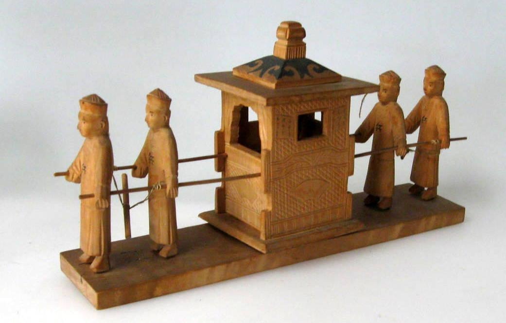 Kinesisk træskærerarbejde i form af mand, der transporteres i en bærestol. o. 1900