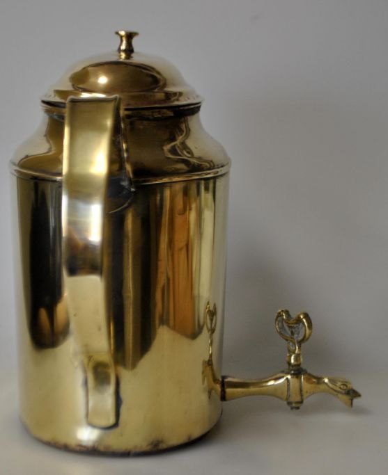 Vand maskine, empire, i messing, o. 1810 - 1820. Danmark. Glat korpus med to hanke, lågknop og hane i form af delfin. På fyrfad med løvefødder og gennembrydninger. H.: 31 cm. B.: 24 cm.