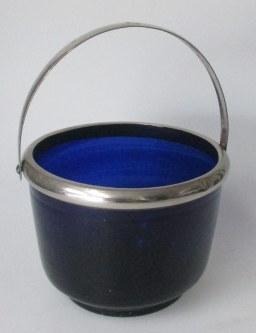 Sukker kumme i cobolt blåt glas, o. 1900. Afsprængt i bunden. Med kant og hank i nikkel med dekorationer. H.: 7,5 cm. Dia.: 10,5 cm.