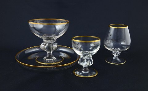 Gisselfeld glas med glat kumme, presset stilk og guldkant på rand og fod. Der er også is asietter til Gisselfeld serien