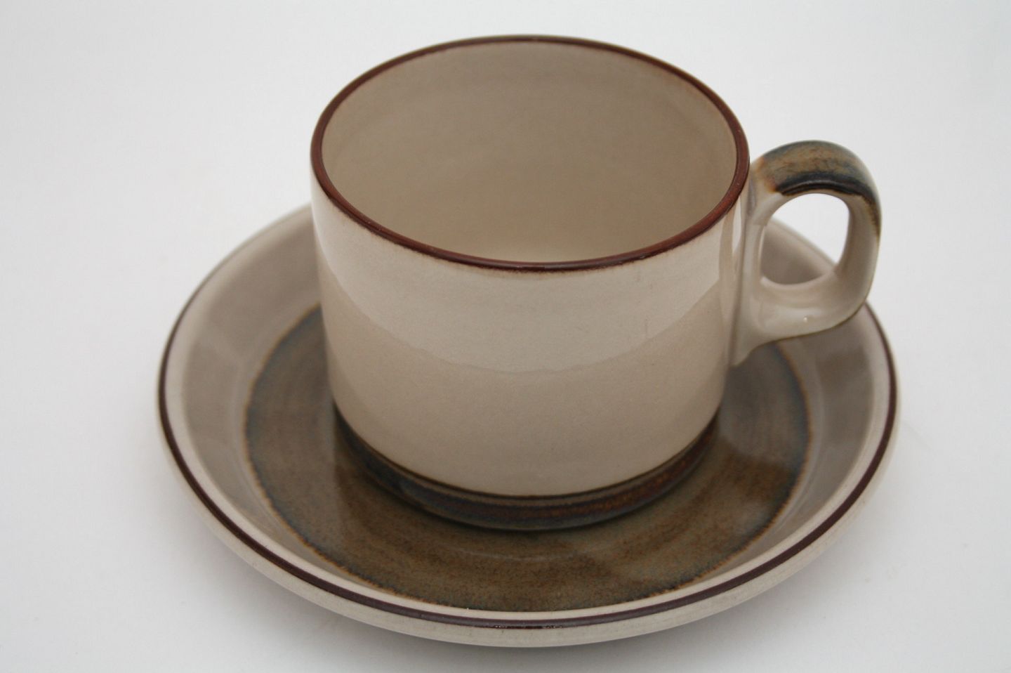 Bing & Grøndahl, Peru stoneware. Lysebrun glasur med mørkebrun kant og bort. Kop med underkop nr. 308. Højde 6 cm. God stand