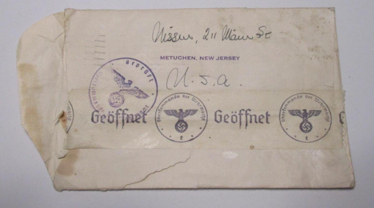 Helsag. WW2. Brev sendt fra Nissen, 211 Maine Street, Metuchen, New Jersey, USA til Hr. & Fru Carl Nielsen, 12 Resenvej, Skive, Danmark. Stemplet i Metuchen den 28. maj 1940, 5 PM. Brevet er åbnet/Geöffnet af Oberkommando der Wermacht, ved ankomsten til Tyskland og prøvet/Geprüft/censureret. Bånd og stempel herfor. Frankeret med 5 Cent. Brevet er sendt med skib. Brevet er sendt til Danmark umiddelbart efter den tyske okkupation af Danmark, den 9. april 1940. Spændende helsag.