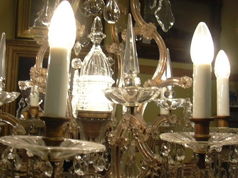 Maria Therese prismekrone Anno:1900-1920 med 8 lysarme i glas og lys i midten. dia: ø 80 cm højde: 100 cm.