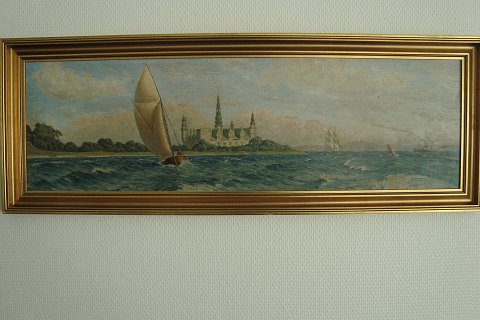 Maleri - Marine med sejlskibe og damper ud for Kronborg.