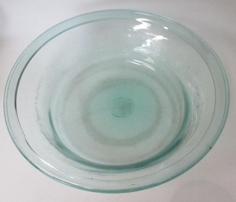 Stort glas fad, 18/19. årh. Grønlig glasmasse. Højde: 7,6 cm. Dia.: 29,4 cm.